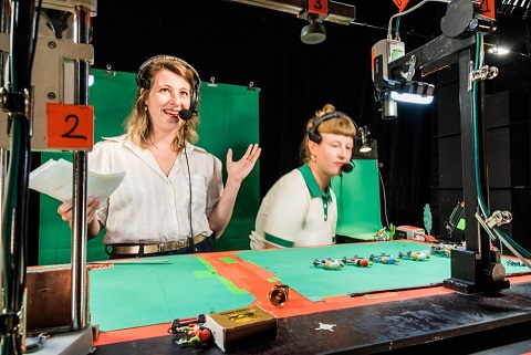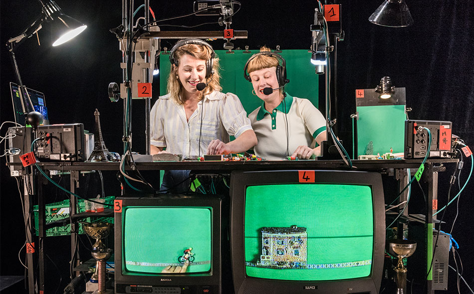 À vous les studios ! est tout-terrain, il se joue partout où c’est possible. Au premier plan, quatre écrans à tube cathodique de différentes tailles. Au second plan, caméras, banc-titre, fond de studio, pour filmer les objets et les visages. C’est la reconstitution du sport à la télévision, presque comme à la maison.