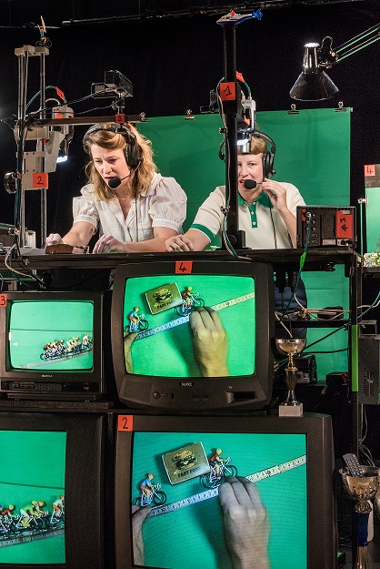 Deux comédiennes bidouilleuses d’objets et d’images vous font revivre une course cycliste où l’absurde côtoie l’imaginaire. Il sera question de top départ et de remise de prix, de défaite et de chute. On y verra l’exaltation de la commentatrice et l’effort du sportif. Le cyclisme, c’est le sport où l’individu compte autant que le collectif, du peloton à l’échappée, pour gagner, le cycliste a besoin de son adversaire. Le cyclisme comme une métaphore de notre société.