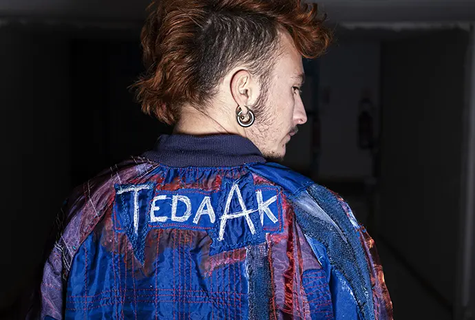 Une identité artistique qui s’invente et s’écrit au travers des esthétiques Tekno, rap, punk et Queer. Usant de l’absurde et de la dérision, il aborde sans réserve des sujets tabous tels que la religion, la police, la sexualité ou le genre. De ces créations par association d’idées, déconstruction et collages, émergent des pièces délirantes, chargé de sens et d’intention, mais également des histoires et des imaginaires dans lesquels la poésie se révèle avec ou sans ironie. Principalement actif sur le plan musical et sonore, TedaAk vise à s’ouvrir aux arts visuels et performatifs, toujours à la recherche de nouvelles formes d’expressions, plus mouvantes, plus déroutantes et plus sincères.